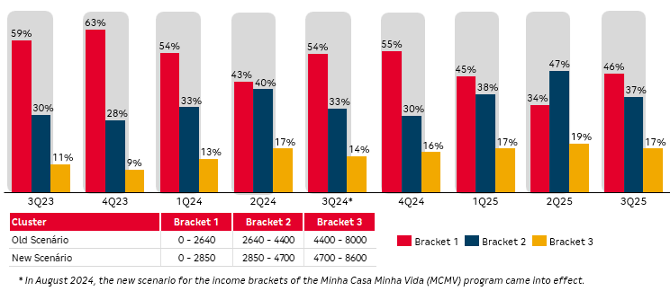 In the third quarter of 2025, Tenda achieved a gross PSV concentration of approximately 46% in families belonging to Bracket Income 1, with a gross monthly family income of up to two minimum wages (R$ 2,850). The chart below illustrates Tenda's scenario divided into MCMV ranges: