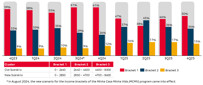 In the fourth quarter of 2025, Tenda achieved a gross PSV concentration of approximately 50% in families belonging to Bracket Income 1, with a gross monthly family income of up to two minimum wages (R$ 2,850). The chart below illustrates Tenda's scenario divided into MCMV ranges: